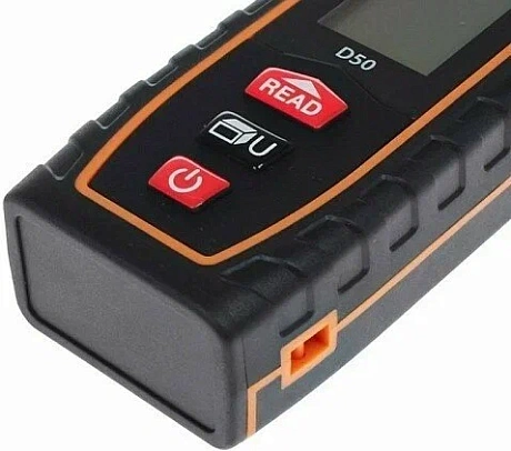 Корпус дальномера RGK D50 изготовлен из прочного прорезиненного пластика и соответствует классу защиты IP 54. Это обеспечивает надёжную защиту прибора от строительной пыли и водяных брызг. При необходимости его можно протереть влажной тряпкой. Для удобства переноски и хранения в стандартную комплектацию прибора входит защитный чехол, а ремешок на руку не даст дальномеру упасть на пол, если он выскользнет из рук.