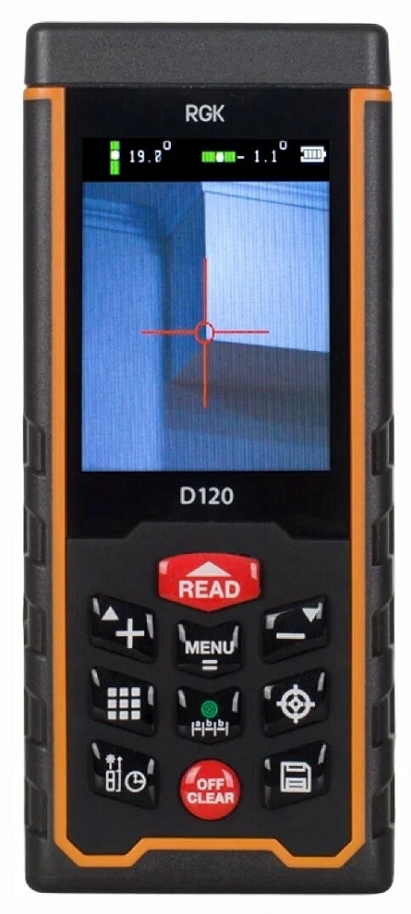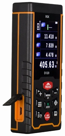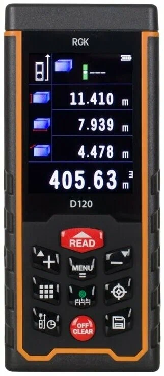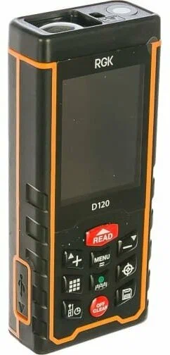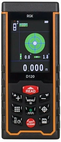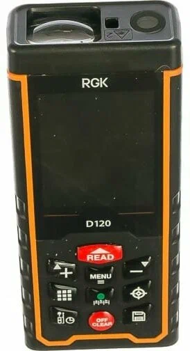 Являясь флагманом линейки дальномеров этого бренда, лазерная рулетка RGK D120 оснащена всеми стандартными функциями:
