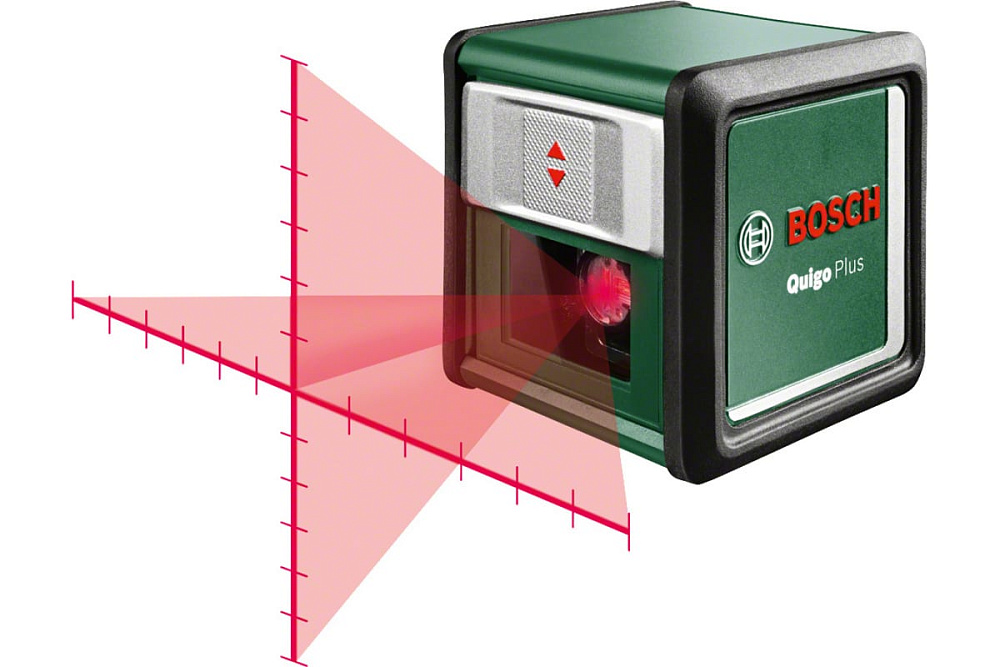 - Простота использования – для включения-выключения Bosch Quigo Plus достаточно открыть или закрыть сдвижную шторку-слайдер; система самовыравнивания автоматически приводит проецируемые лучи в вертикальное/горизонтальное положение либо переводит лазер в мигающий режим при наклоне корпуса более 4°.