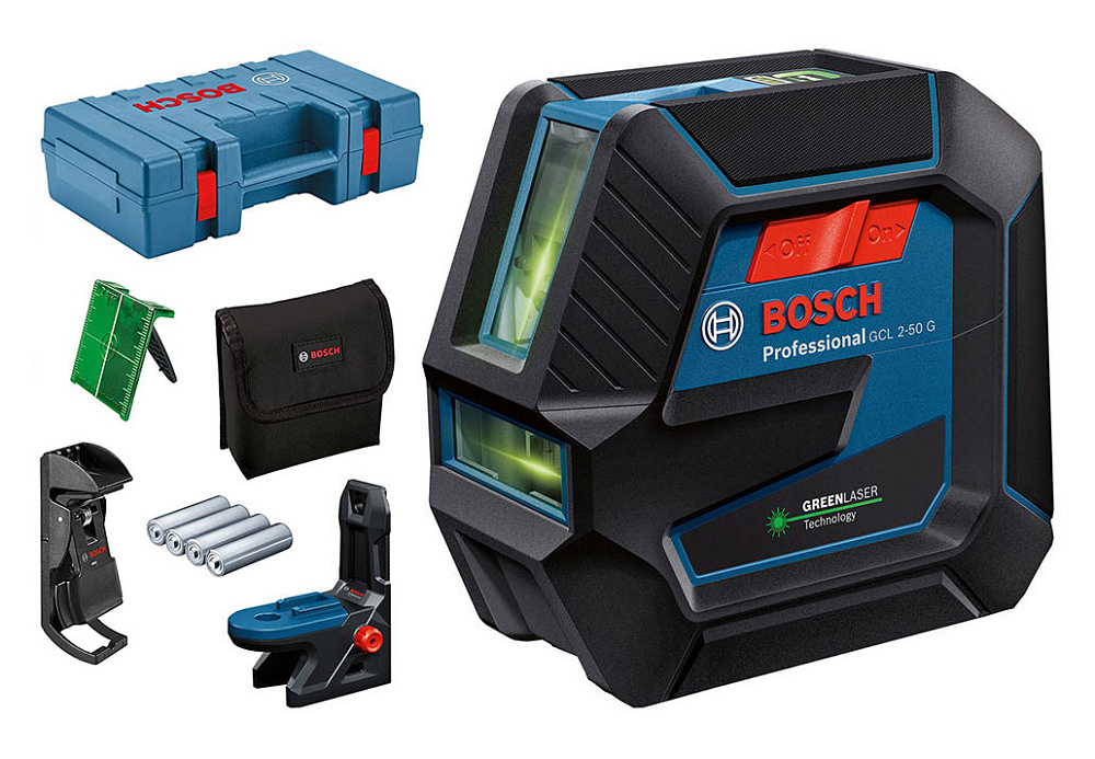 - Лазерный крест + 2 точки для упрощенного позиционирования лазерного уровня Bosch и переноса разметки.