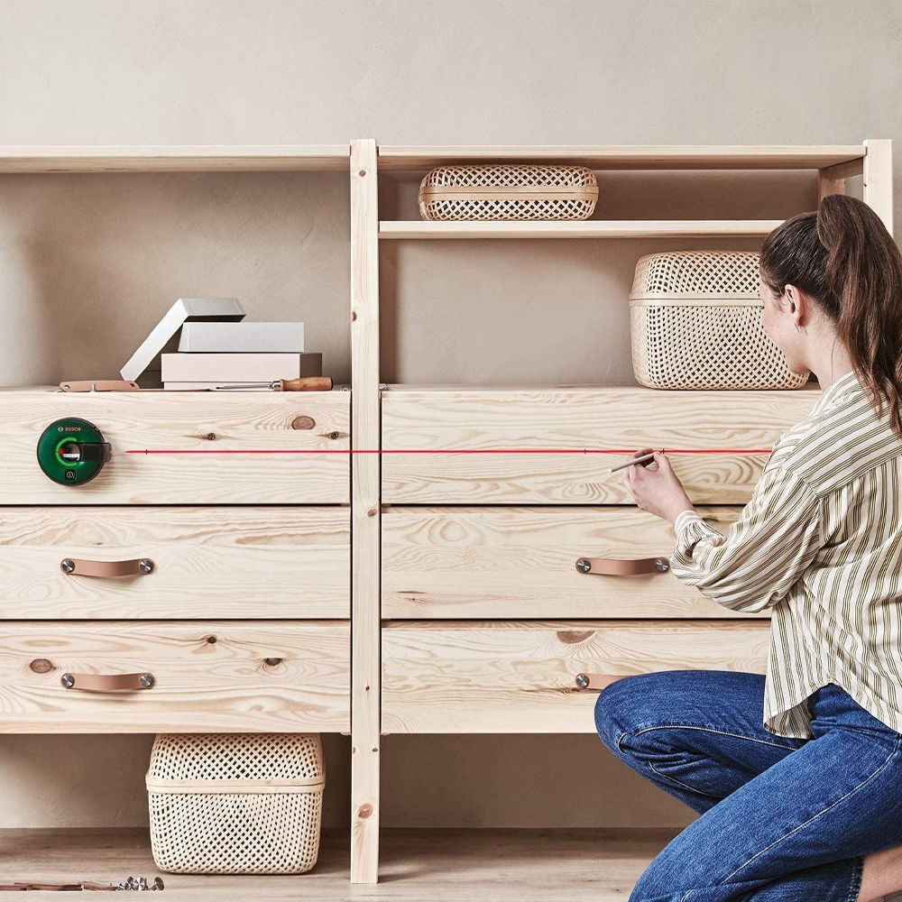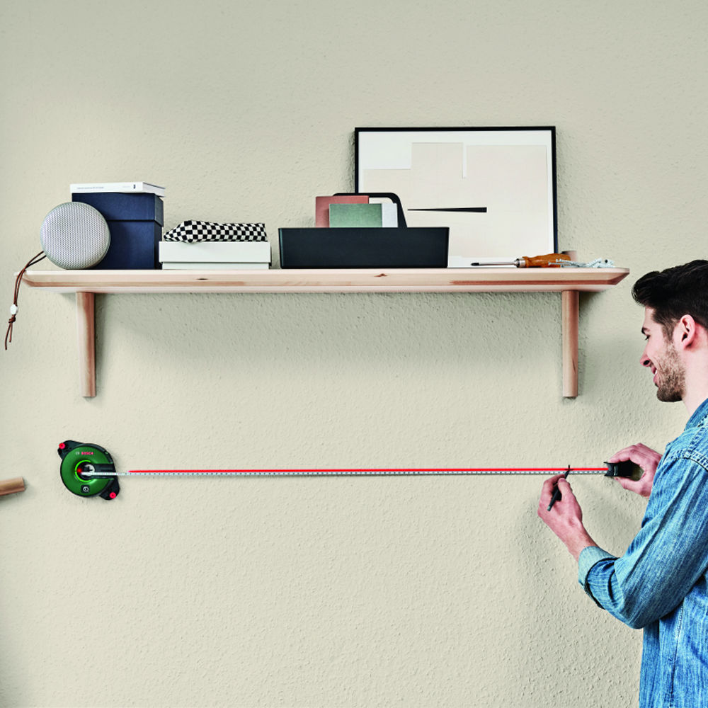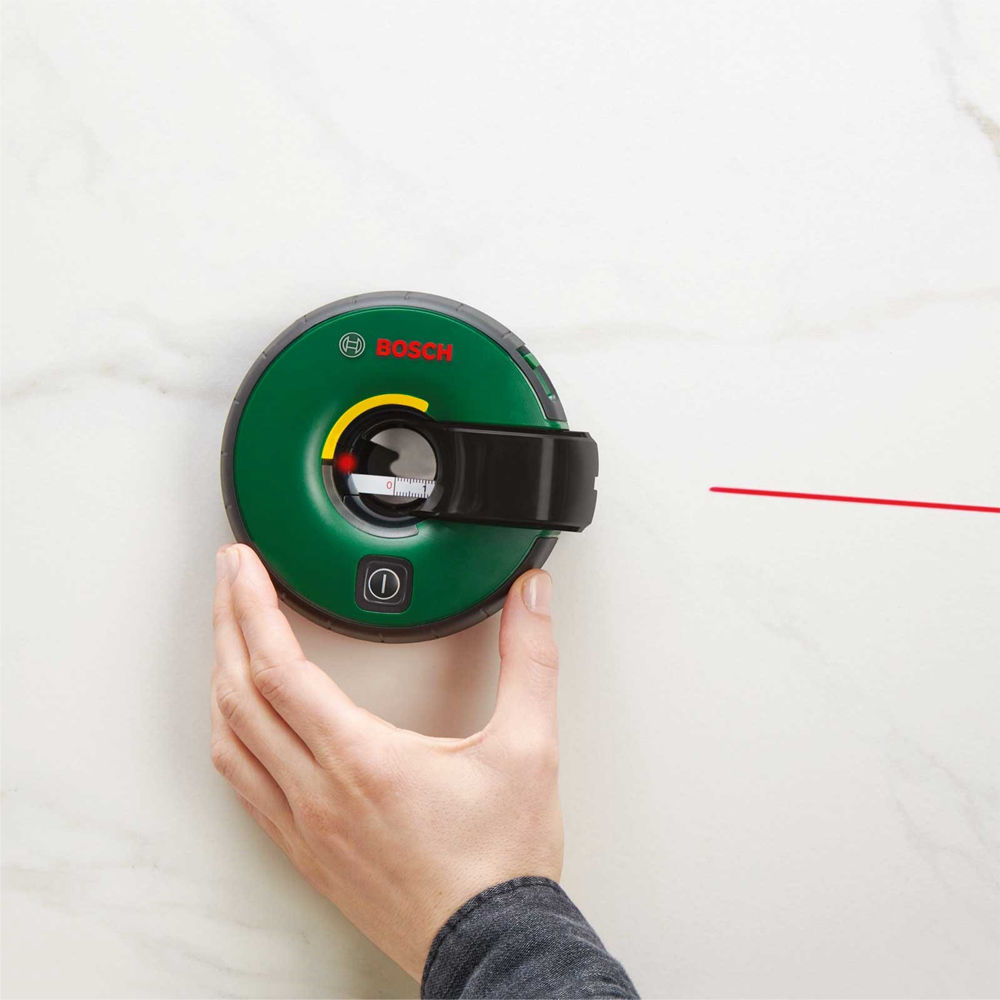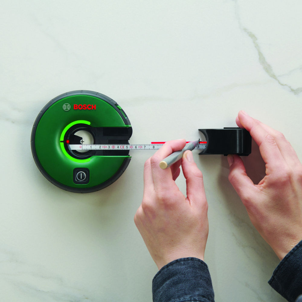 Лазерный уровень Bosch оборудован мерной лентой длиной 1.5 м. Такая конфигурация особенно удобна для разметки и планирования мест установки декора - достаточно ровно выставить прибор и проставить необходимые отметки на лазерной линии при помощи рулетки. Быстро, легко и с минимальной погрешностью ±0.3 мм/м. Паз на корпусе позволяет сделать маркировку точки отсчета.