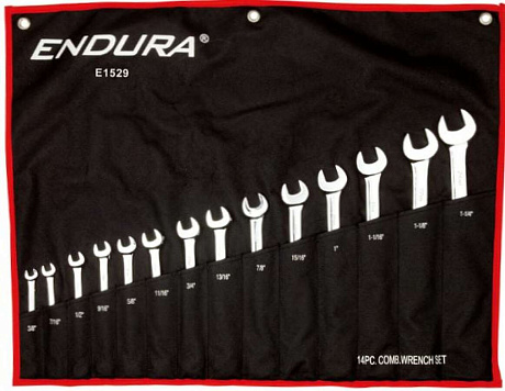 Endura E1529 - набор комбинированных гаечных ключей, выполненных из кованой хром-ванадиевой и полированной стали. Ключи соответствуют требованиям стандартов ANSI.