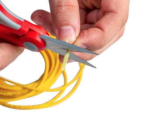 Предназначены для разрезания кевларовой ткани (Kevlar®) и кевларовых нитей при монтаже оптического кабеля или производстве патч-кордов. Также пригодны для резки изоляции кабеля, кабельных стяжек, пластика и других материалов. Ножницы изготовлены из высоко углеродистой нержавеющей стали с твердостью 58-60 единиц по шкале Роквелла, что является максимальным значением твердости для ножа, так как при более высоких значениях лезвие становится, хоть и тверже, но более хрупким. Одно лезвие ножниц имеет серрейторную (зазубренную) заточку, чтоб удерживать материал при разрезании и не допустить его выскальзывания. Инструмент оснащен регулировочным винтом, закрытым защитным колпачком.