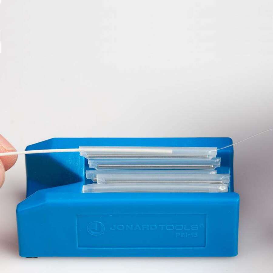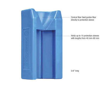 Jonard PSI-15 представляет из себя небольшой контейнер, вмещающий 15 защитных гиль длиной 40 или 60 мм. Один край устройства выполнен в форме лейки с прорезью сверху. Сварщику достаточно примерно направить оптоволокно в эту лейку, далее оно само найдет путь в отверстие термоусадочной трубки. Потянув волокно вверх, Вы достанете его из контейнера уже с надетой трубкой.