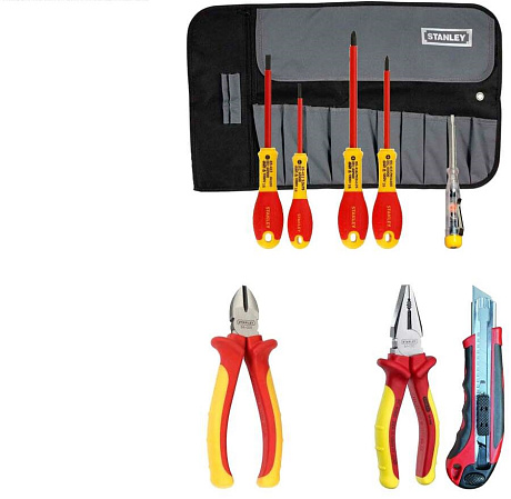 Также, в наборе содержится профессиональный изолированный до 1000 В инструмент электрика. Губцевые инструменты (пассатижи, длинногубцы и кусачки) изготовлены ковкой из прочной высокохромистой стали с последующей термообработкой. Режущие кромки с индукционной закалкой доведены вручную. Особая конструкция оси обеспечивает плавный ход.