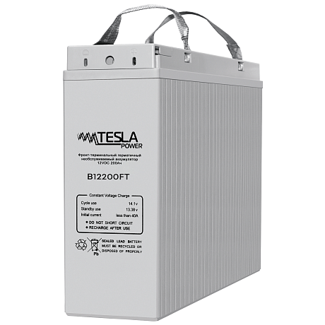 Свинцово-кислотный герметичный необслуживаемый аккумулятор Tesla Power с регулируемым клапаном VRLA (Valve-Regulated Lead-Acid) с внутренней рекомбинацией газа и абсорбированным электролитом (технология AGM Absorbent Glass Mat). Фронтальное исполнение. Батареи Tesla Power предназначены для установки в 19, 23 дюймовые шкафы и стойки, также используются в других случаях, когда необходимо компактное размещение батарей. Фронтальное расположение клемм облегчает установку и сокращает время на обслуживание и замену батарей. Хорошие характеристики при небольших токах разряда делают эти батареи лучшим выбором для телекоммуникационных систем и других ответственных нагрузок, рассчитанных на длительное время автономии.