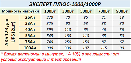 В моделях нет внутренних аккумуляторов!!!, ИБП работают только с внешними аккумуляторными батареями. Увеличенные показатели зарядного тока позволяют работать с батареями большой ёмкости (от 26Ач-120Ач). Для модели Эксперт Плюс-1000Р напряжение в группе составляет 24В, что диктует подключение 2 штук батарей к каждому ИБП в качестве номинального количества.
