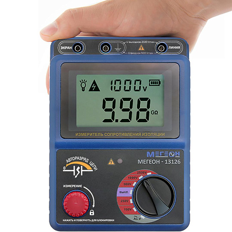 Измеритель сопротивления изоляции МЕГЕОН 13126 представляет собой портативный прибор для измерения сопротивления изоляции с использованием высоких значений испытательных напряжений (до 2500 Вольт). Корпус прибора имеет стильный двухцветный внешний вид и яркие наклейки- указатели. Для проведения испытаний предусмотрено пять тестовых напряжений: 100В, 250В, 500В, 1000В, 2500В. А также предусмотрено выключение испытательного напряжения по окончании измерения. Благодаря наличию яркой светодиодной подсветки дисплея предоставлена возможность работы в условия недостаточной видимости или в отсутсвуии освещения. Для сохранения уровня заряда элементов питания предусмотрена функция автоматического выключения питания. Измеритель сопротивления изоляции (мегаомметр) внесен в государственный реестр СИ, под номером 74507-19, срок периодической поверки составляет два года.
