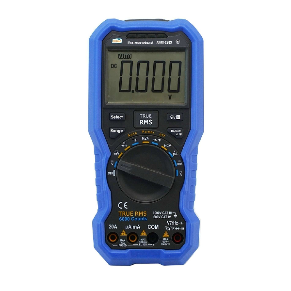 AKIP-2203 - Цифровой мультиметр, позволяющий проводить измерения постоянного/переменного тока и напряжения, сопротивления, частоты, емкости, проверять диоды, прозванивать проводники, измерять температуру, истинное и квадратичное значение TrueRMS и многое другое. Мультиметр прост в использовании, имеет удобную форму корпуса, сочетает в себе точность, безопасность и надежность. Подходит для использования на производстве, в электроэнергетике, коммунальном хозяйстве, строительстве и других сферах.