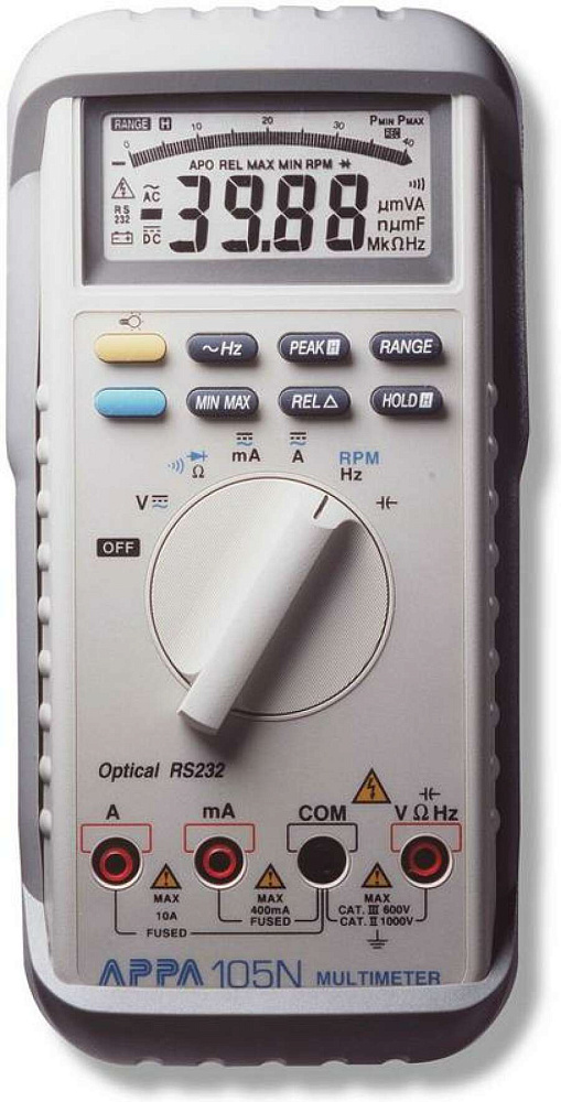 Профессиональный цифровой мультиметр APPA 105N позволяет проводить измерения постоянного/переменного тока и напряжения, сопротивления, частоты, емкости, проверять диоды, прозванивать проводники и многое другое. Мультиметры серии 100N оснащены RS-232 интерфейсом с оптической развязкой, обеспечивающим безопасное и лёгкое подключение к ПК для калибровки и передачи накопленных данных.