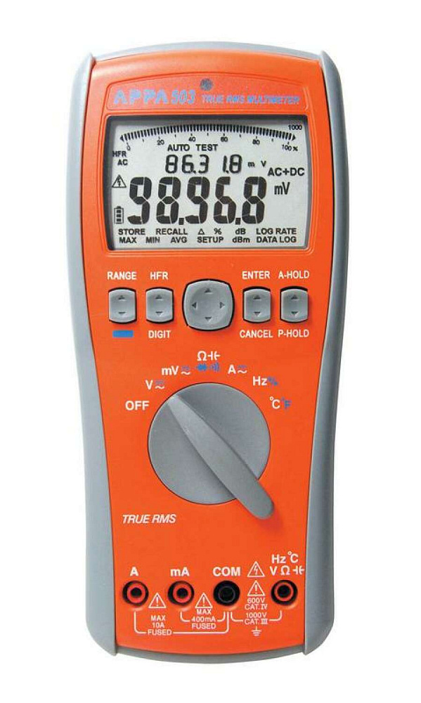 Профессиональный цифровой мультиметр APPA 503 позволяет проводить измерения постоянного/переменного тока и напряжения, сопротивления, частоты, емкости, температуры, проверять диоды, прозванивать проводники и многое другое. Мультиметр оснащен USB интерфейсом с оптической развязкой и регистратором на 20000 ячеек.
