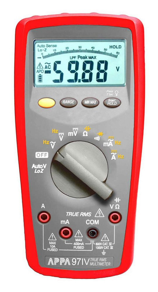Профессиональный цифровой мультиметр APPA 97IV позволяет проводить измерения постоянного/переменного тока и напряжения, сопротивления, частоты, емкости, проверять диоды, прозванивать проводники и многое другое. Функция НЧ-фильтрации (LPF mode) блокирует электрические помехи, наведенные шумы и ВЧ составляющие входного сигнала для обеспечения устойчивой индикации, в том числе при измерениях в ЭУ и электроприводах с частотным регулированием. Cерия промышленных мультиметров предназначена для жёстких условий эксплуатации на производстве, в электроэнергетике, коммунальном хозяйстве, строительстве и других сферах, где востребованы критерии: безопасность, удобство, компактность, точность, надежность.