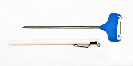 Для работы с термометром необходимо снять защитный чехол, нажать кнопку «ON/OFF» (Вкл. /Выкл.) и поместить щуп (не менее, чем наполовину своей длины) в измеряемую среду. На экране отображается текущее значение температуры среды измерения. Для увеличения реального срока службы батареи термометр автоматически выключается примерно через 20 минут.