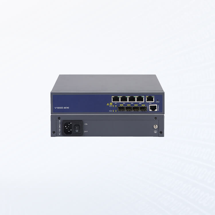 Оптический линейный терминал (мини) V-SOL V1600D-MINI EPON OLT 4 SFP – это надёжное и компактное устройство высотою в 1U, что позволяет установку в малогабаритных помещениях. V1600D-MINI обеспечивает интерфейс 4GE для восходящей линии связи и 4 порта EPON для нисходящей. Он может поддерживать 256 ONU при соотношении разделителей 1:64.