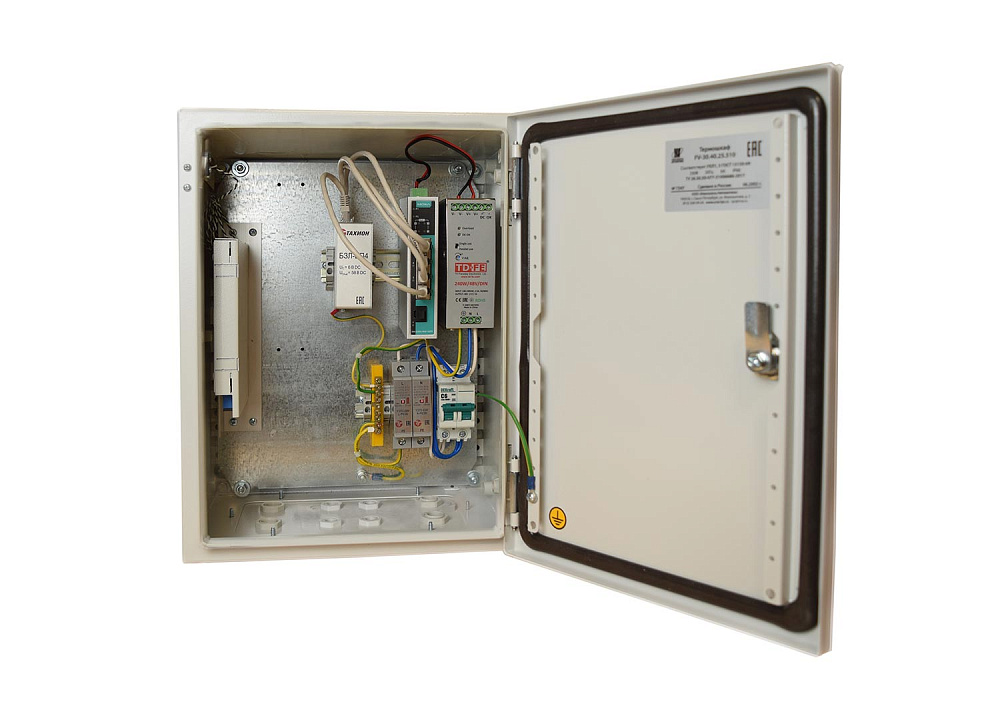 Шкаф телекоммуникационный уличный, металлический, герметичный, класс защиты IP66, без обогрева, с защитой от импульсных перенапряжений 2-го класса, оптическим кроссом, автоматом защиты питающей линии напряжения, блоком питания и неуправляемым коммутатором EDS-G205A-4PoE-1GSFP-T с 4 портами РоЕ Gigabit, 1 медным портом Gigabit и 1 слотом под Gigabit SFP. Диапазон рабочих температур от -40 °С до +50 °С. Габариты 300х400х210 мм.