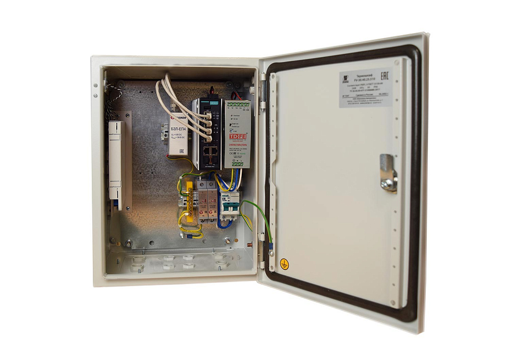 Шкаф телекоммуникационный уличный, металлический, герметичный, класс защиты IP66, без обогрева, с защитой от импульсных перенапряжений 2-го класса, оптическим кроссом, автоматом защиты питающей линии напряжения, блоком питания и управляемым коммутатором EDS-P506E-4PoE-2GTXSFP-T с 4 портами РоЕ и 2 комбинированными портами Gigabit. Диапазон рабочих температур от -40 °С до +50 °С. Габариты 300х400х210 мм.