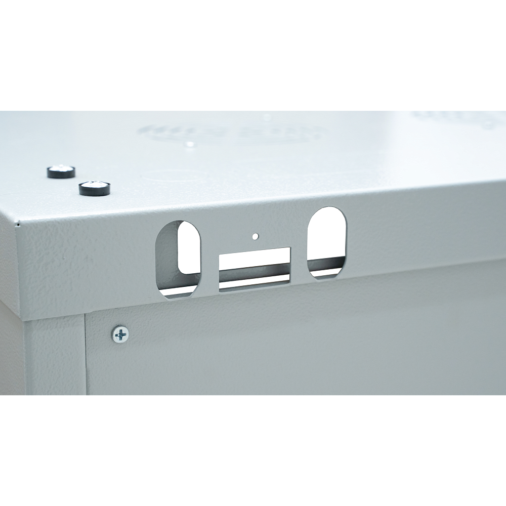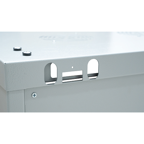 Ввод кабеля осуществляется через верхнюю или нижнюю панели шкафа через предусмотренные кабельные вводы размером 340х56мм. В крышу шкафа предусмотрена установка двух 120мм вентиляторов либо вентиляторного модуля.