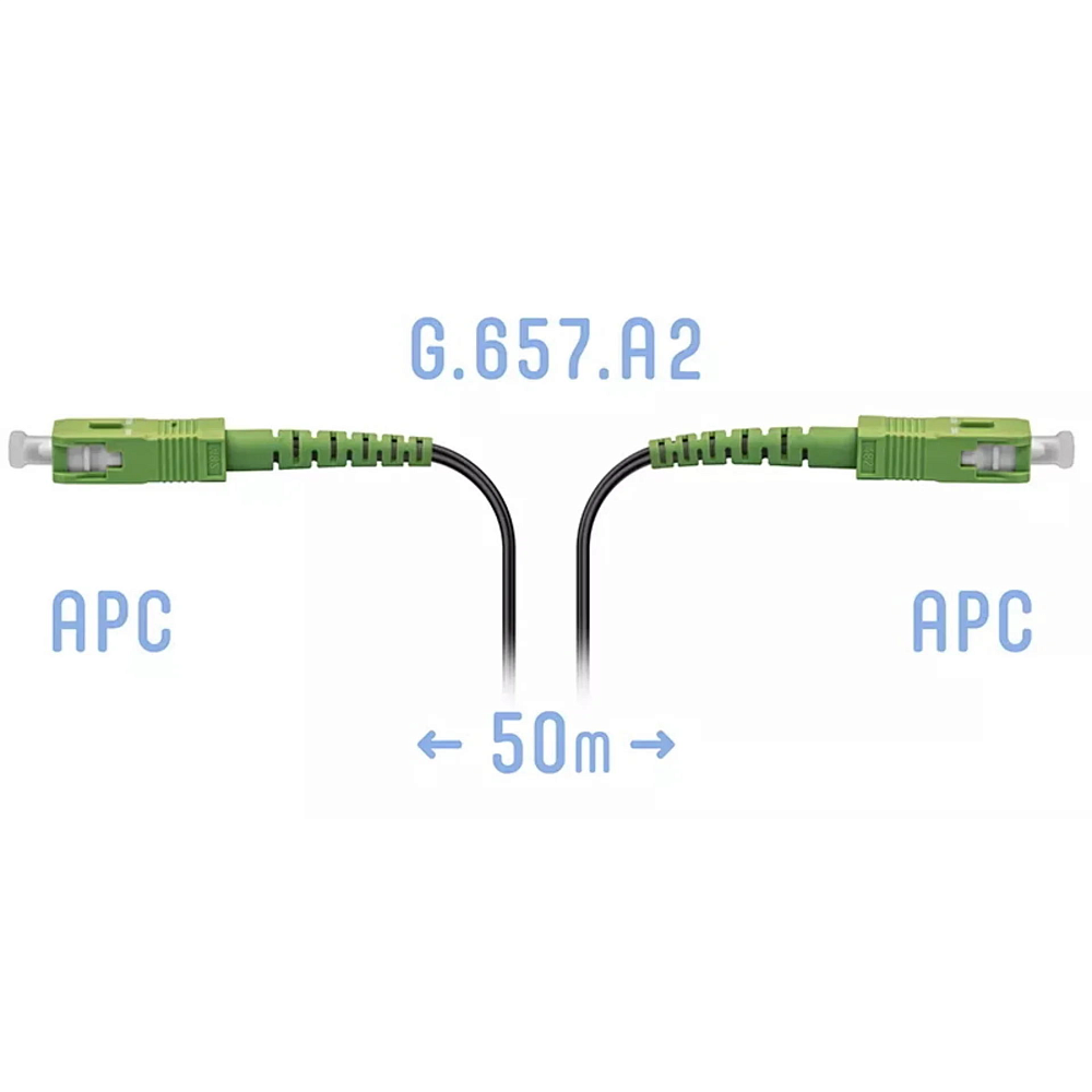 Патчкорд FTTH SC/APC-SC/APC представляет собой отрезок одноволоконного FTTH-кабеля, усиленного двумя стальными проловоками, длиной 50 метров, оконцованный с двух сторон оптическими коннекторами SC, тип полировки - APC (Angled Physical Contact). В данных патчкордах используется одномодовое волокно с уменьшенными потерями на изгибе G.657.A2.