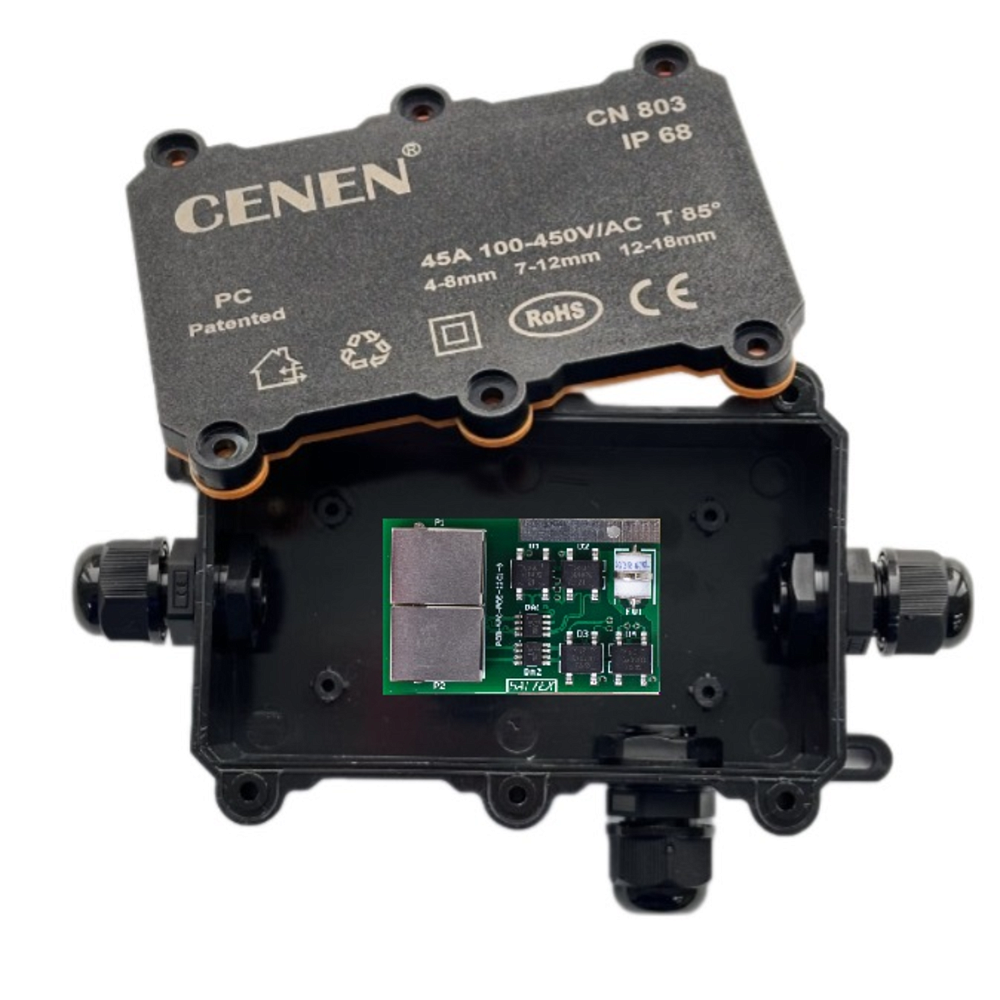 Исполнение устройства печатная плата в пластиковой коробке разветвительной Cenen с кабелем заземления. В основе грозозащиты стоит модуль SNR-SPNet-BР1000, реализована двух уровневая защита: «линия - земля», «линия - линия». Gigabit Ethernet обеспечивается на длине кабеля 50м, 10/100Base Ethernet обеспечивается на длине кабеля 100м.