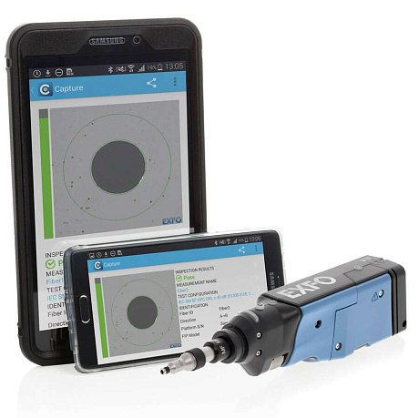 EXFO FIP-435B - простой в использовании беспроводной видеомикроскоп для осмотра торца оптических коннекторов и портов патч-панелей. В качестве экрана используется смартфон, или планшет на базе ОС Android и iOS к которым видеопробник подключается по встроенному Wi-Fi. Для его использования достаточно установить мобильное приложение ConnectorMax2 на устройство Android или iOS, что превращает его в полноценное решение для проверки торцов ферул оптоволокных коннекторов.